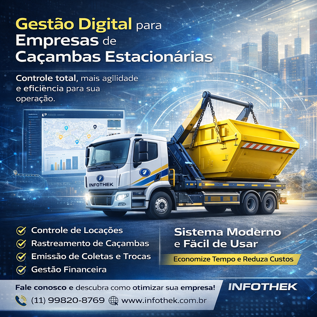 A Infothek oferece soluções completas para gestão e locação de caçambas estacionárias, atendendo empresas e prestadores de serviços da construção civil.